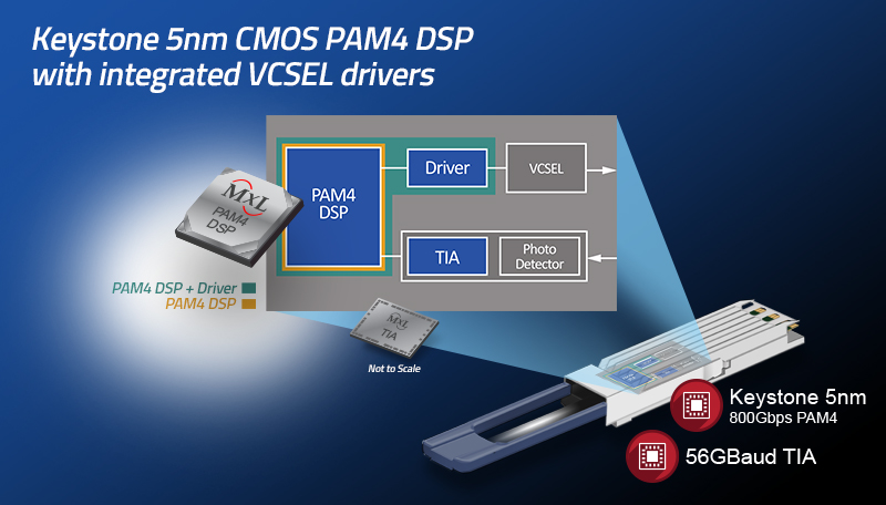 “With the explosion in deployments of AI clusters, the demand for multimode transceivers and AOCs continues to accelerate for 100G/lane 400G and 800G interconnects. These applications needed integrated, low-power, high-performance, cost-effective solutions to support the massive scale of these networks,” said Drew Guckenberger, Vice President of High Speed Interconnect at MaxLinear. “Our 5nm Keystone PAM4 DSP with integrated VCSEL drivers addresses the demands of this key market, enabling best-in-class power consumption of <10W for 800G short reach optical transceivers and AOCs.”