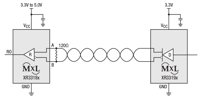 The receiver includes enhanced failsafe circuitry, guaranteeing a logic-high receiver output when the receiver inputs are open, shorted, or undriven. The XR33180/81/83/84 (XR3318x) receiver input impedance is at least 48kΩ (1/4 unit load), allowing more than 128 devices on the bus. The bus pins are ESD protected and pass IEC61000 level 4 (±15kV).